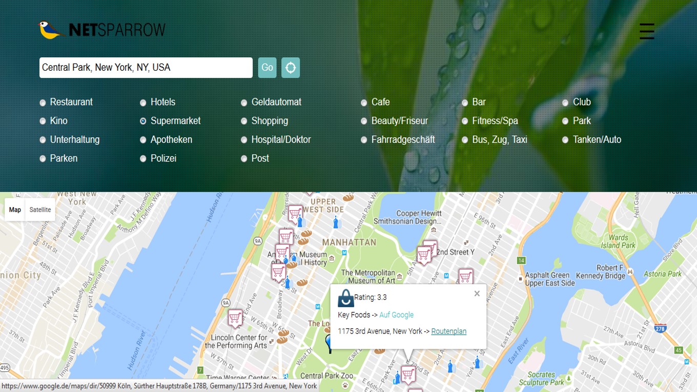 Curious? Frequently on the go? Then you will like the "nearby search". On your mobile device you can find all the information about your nearby area (for example, restaurants, ATMs, pharmacies). Via click on a place netsparrow leads you there by the route planner.